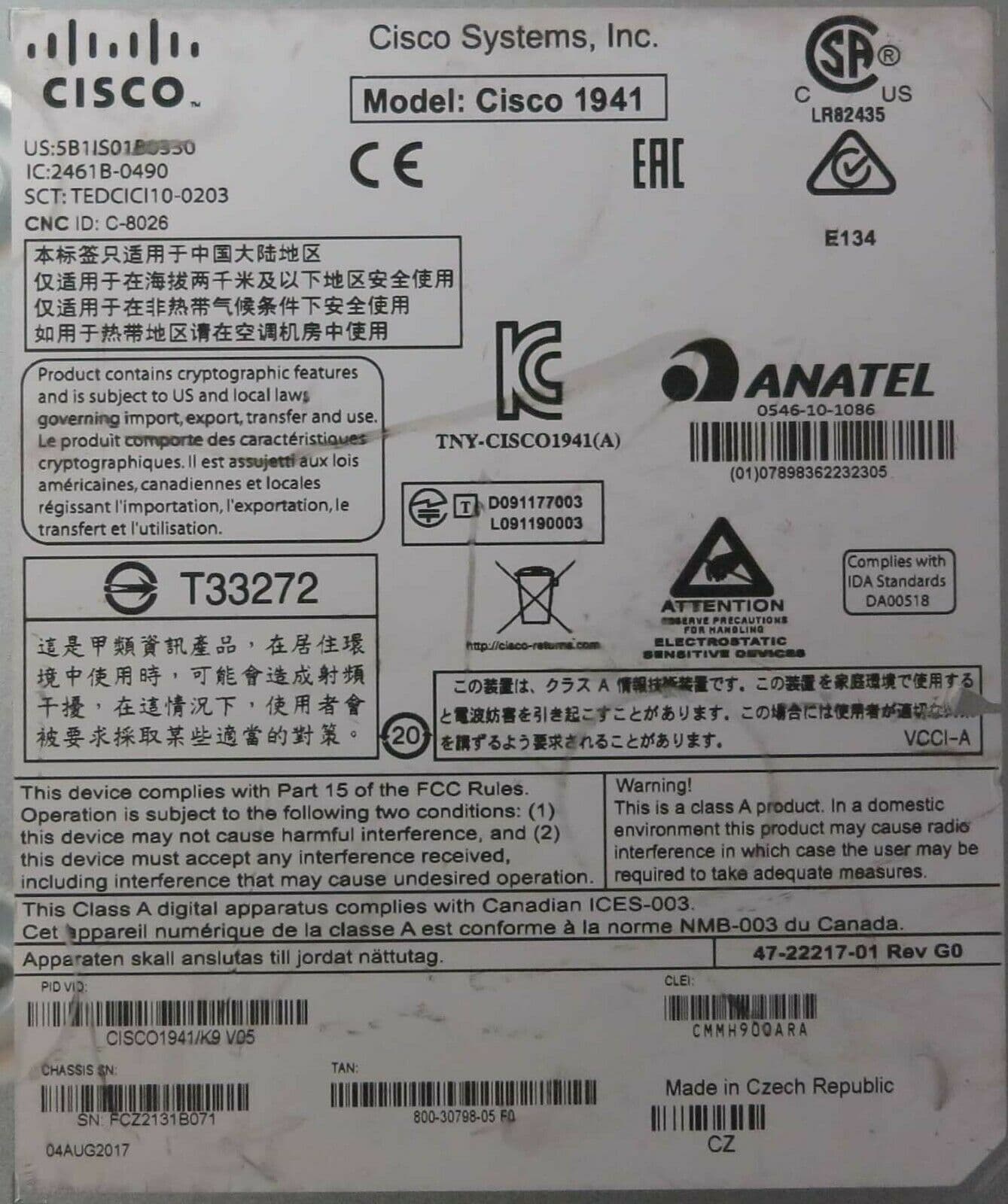 PID:CISCO1941/K9 , VID: V05 , SN:FCZ2131B07E