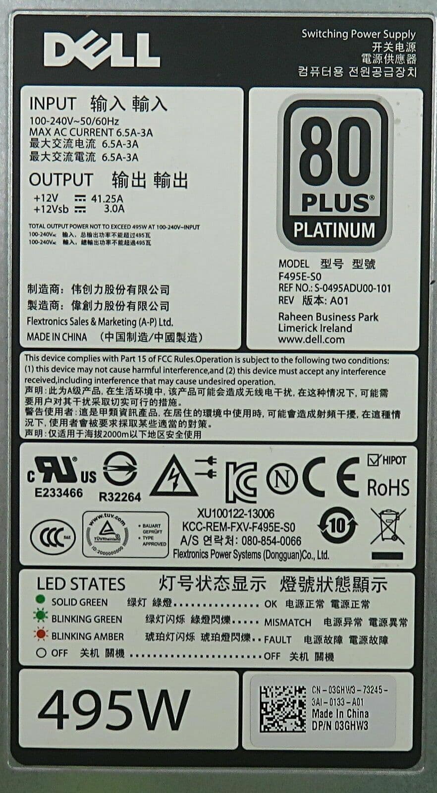 Dell PowerEdge R420 R720 T420 495W 80Plus Platinum Redundant